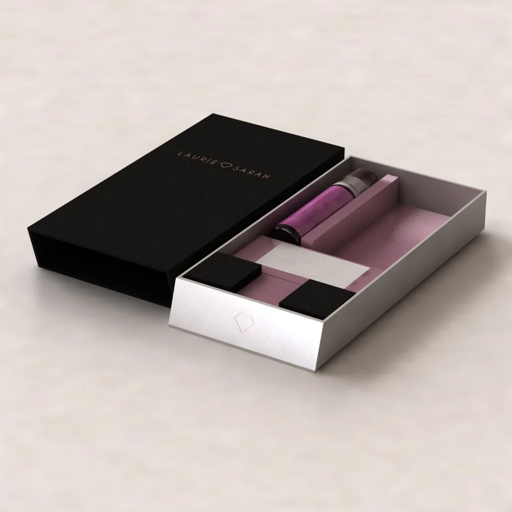 Box Design I did to fit all the companies items. An all-in-one box with replaceable parts to accommodate 1 ring, bracelet, necklace, two rings, ring cleaner, pamphlet, business card, and policies.